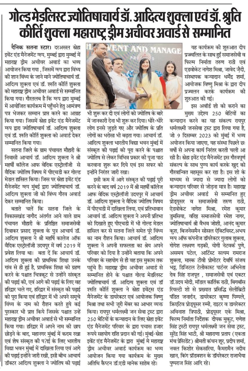 • महाराष्ट्र ड्रीम अचीवर अवार्ड – ज्योतिषी और उद्यमी के रूप में उनकी प्रेरणादायक यात्रा के लिए।